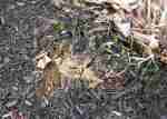 Curious I walked over to the edge of the pond and there sat Goliath on top of a lily pad pot. A couple tan tail feathers protruded from his mouth. If ever a frog could, he had a ‘rats, foiled again’ look on his face.