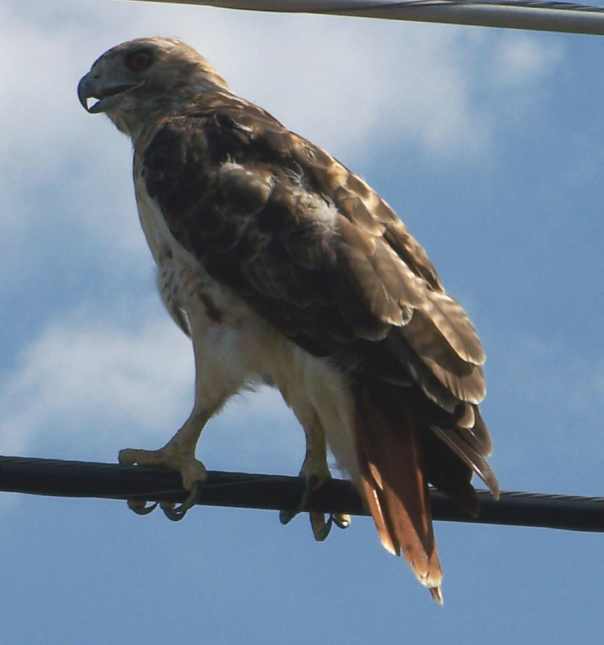 I wandered out to the garden this afternoon to take a break from writing and I was glad I did. I got one heck of a photo op. There, directly behind my yard, up on a telephone wire, sat a red-tailed hawk. I dashed inside for my camera praying that no one scared him off while I was inside.