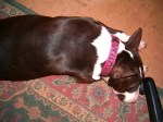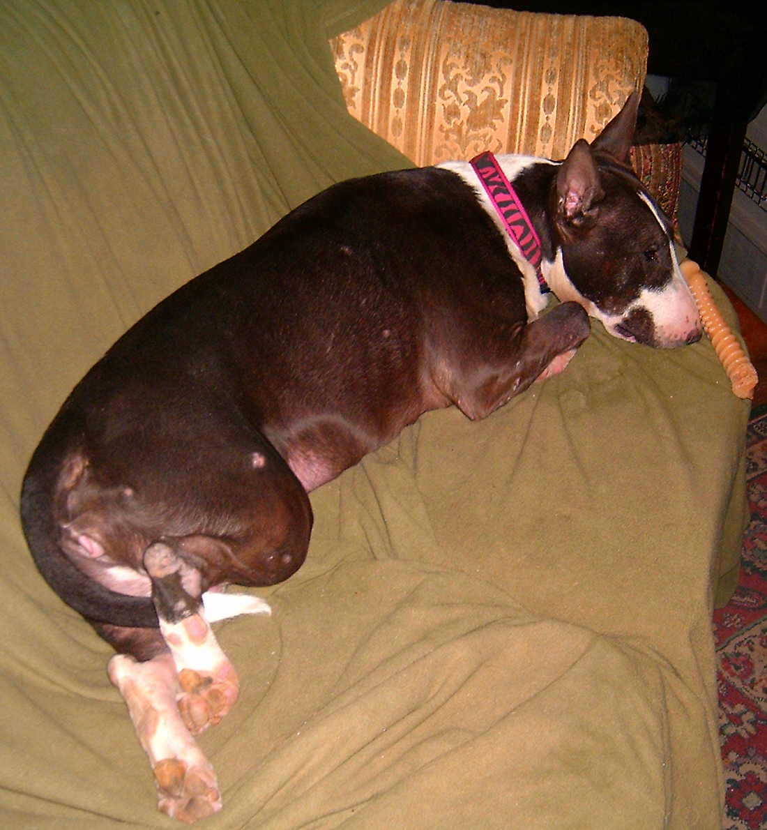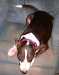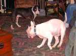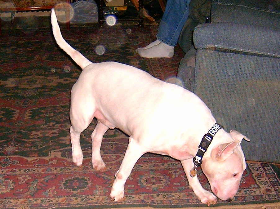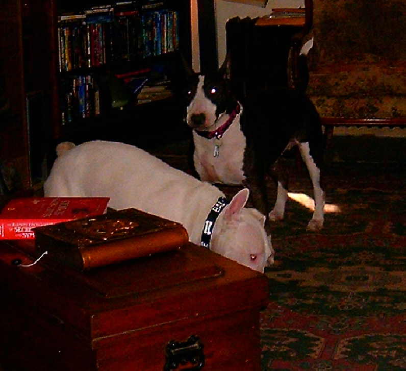 Life with Bull Terriers is never dull. My back is feeling a lot better now. Then last night Gavin leapt on the foot rest of my chair taking out my ankle, foot, and big toe in the process. My big toe–bruised, my ankle–slightly sprained, my foot–scratched and bruised.