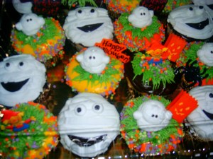 Decorations up? Almost done. Vampire teeth, skulls, and bones ice cubes made? Check. Candy? Check. Lasagna ready? Check. Fancy Halloween cupcakes ready to go? Check. Wine and drinks ready? Check.
