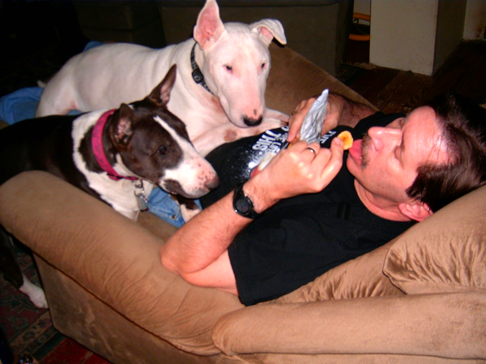 Gavin here. Daddy was snacking on nanner chips again. Patty and I tried to mooch some. The Curmudgeon finally gave in and gave us some! Yay!