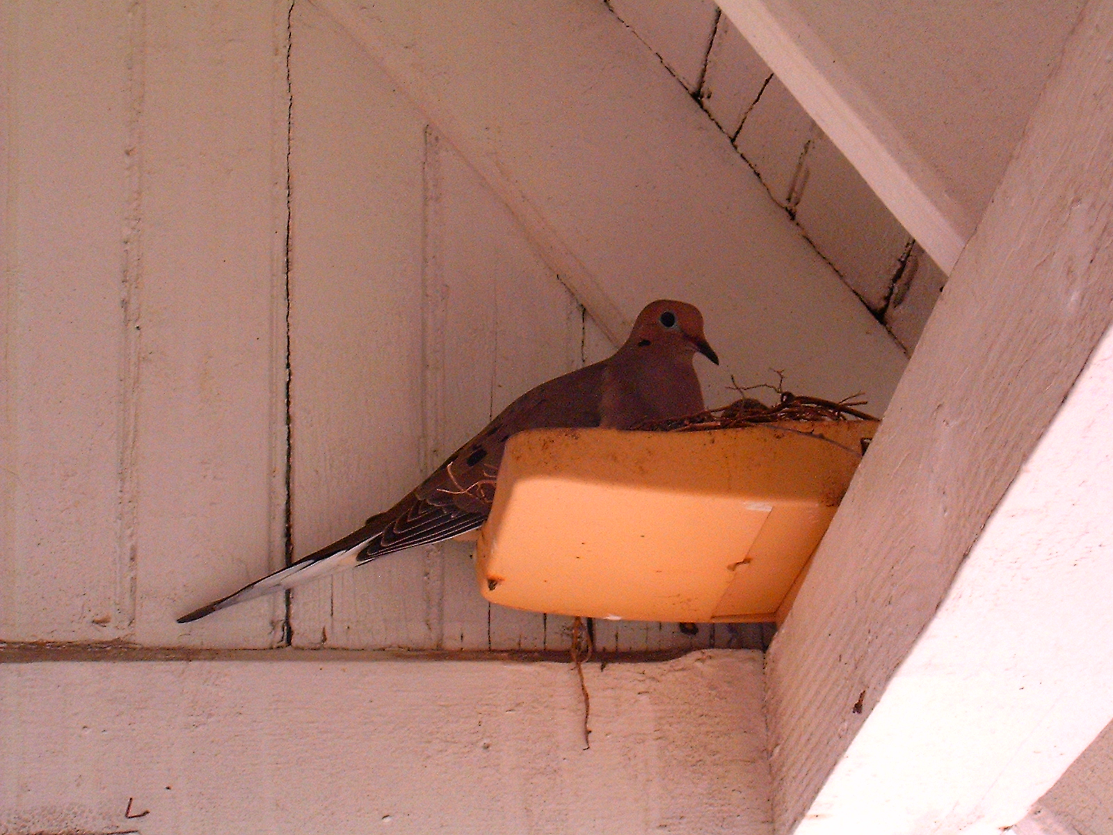 Every year a dove nests here. For years they made messy attempts to but couldn’t make it work. Finally, several years ago, The Curmudgeon put that plastic shelf up for them.