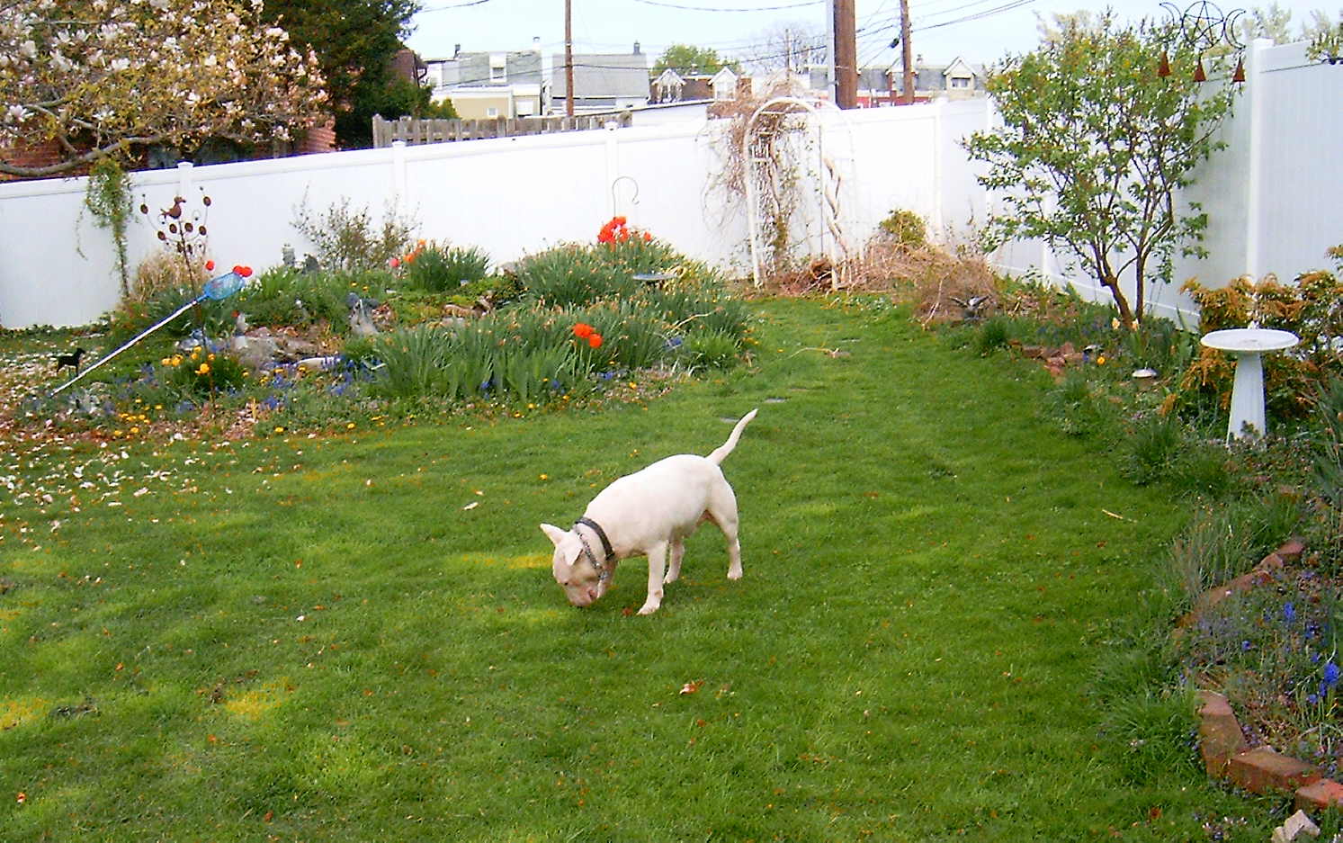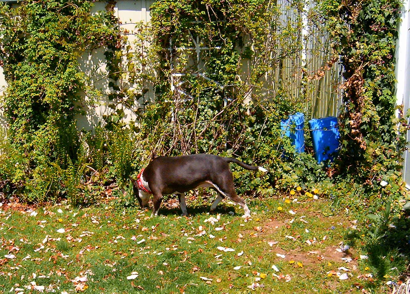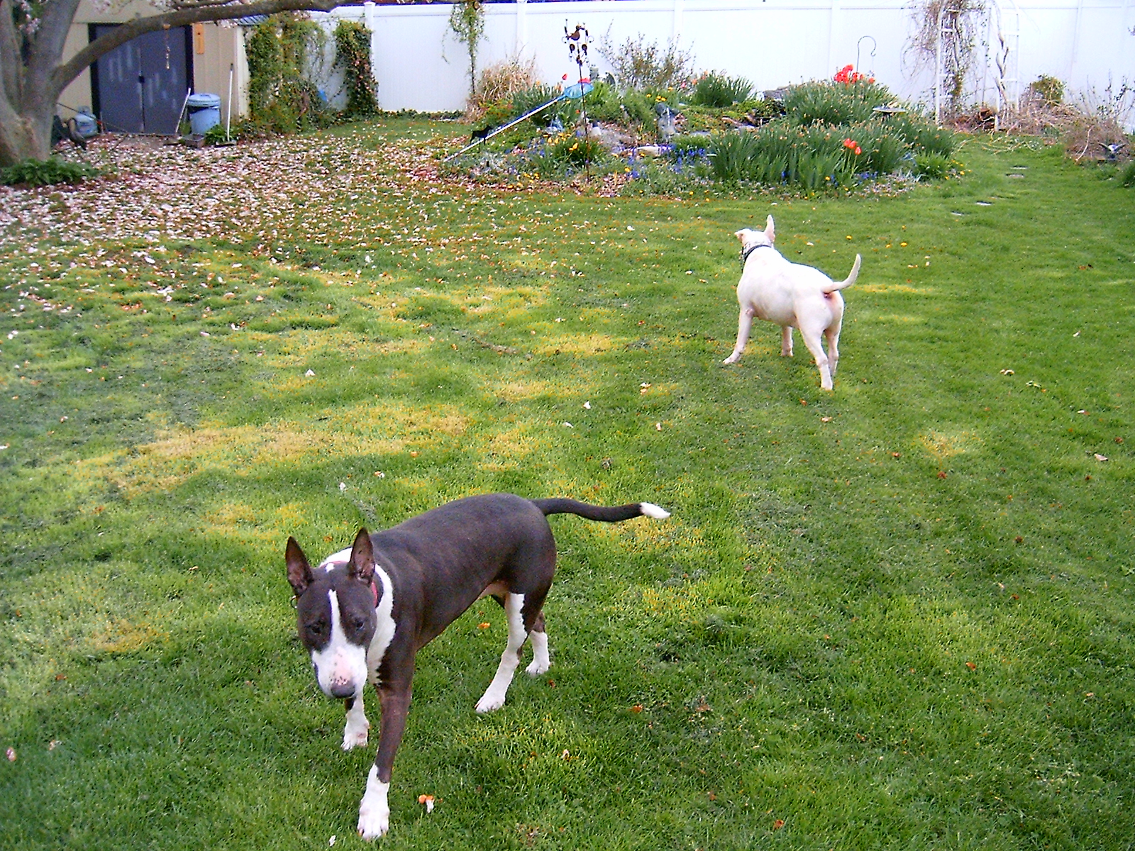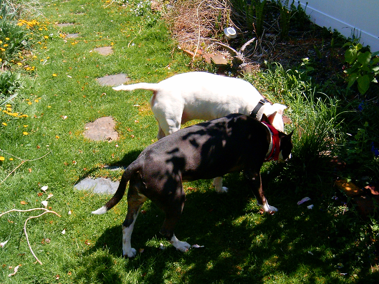 Oh, yeah the theory…if I keep taking the dogs outside with me eventually they will get bored with grazing or beating the crap out of each other and will begin to relax in the yard and let me work rather than have to keep my eyes on them all the time.