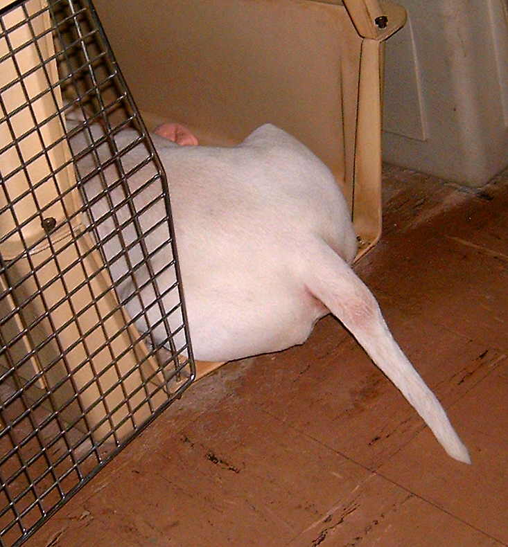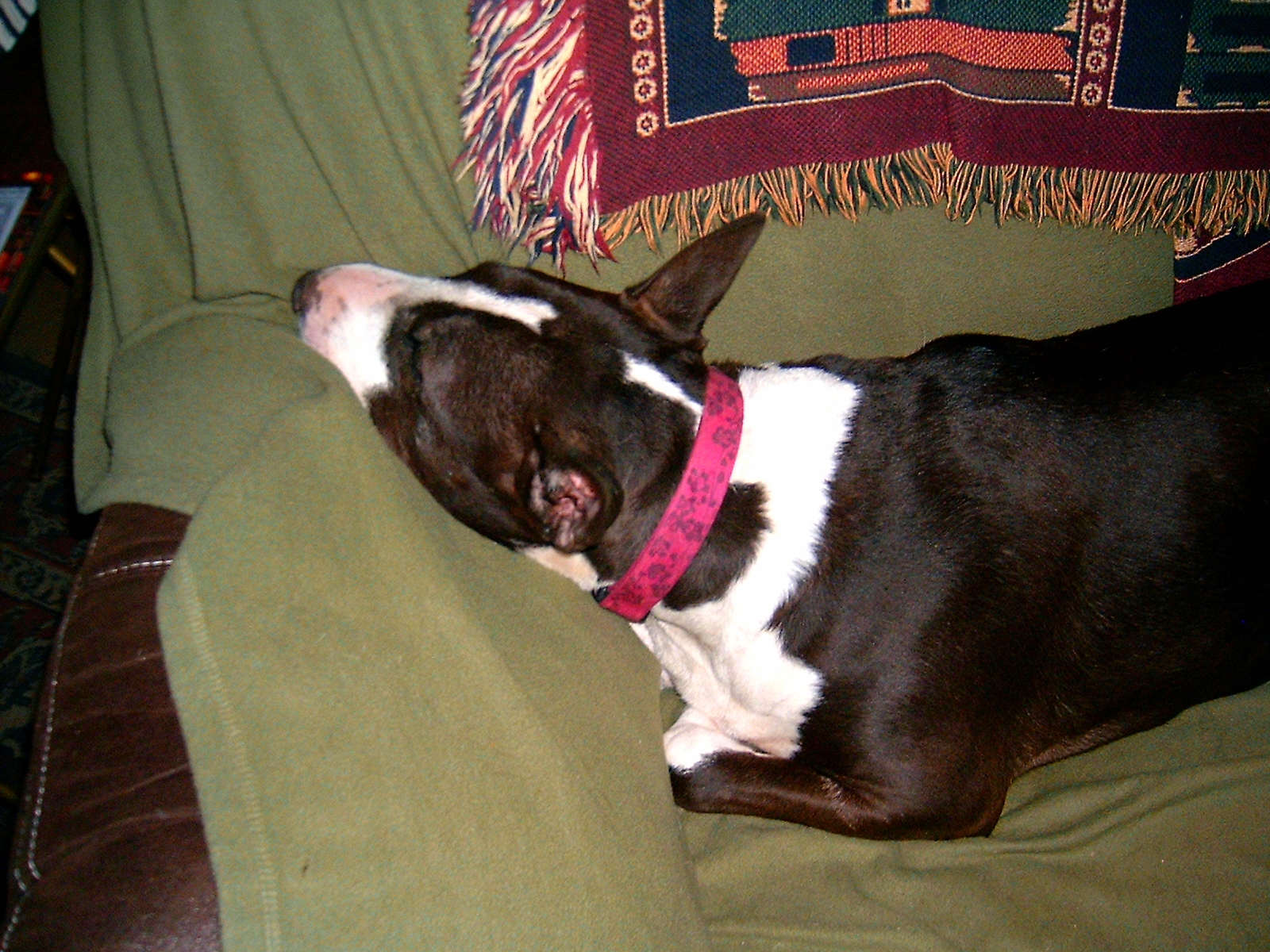 Poor Patty, all worn out from a busy day of barking at the UPS man, snoozing in her crate, and snoozing in Daddy’s chair.