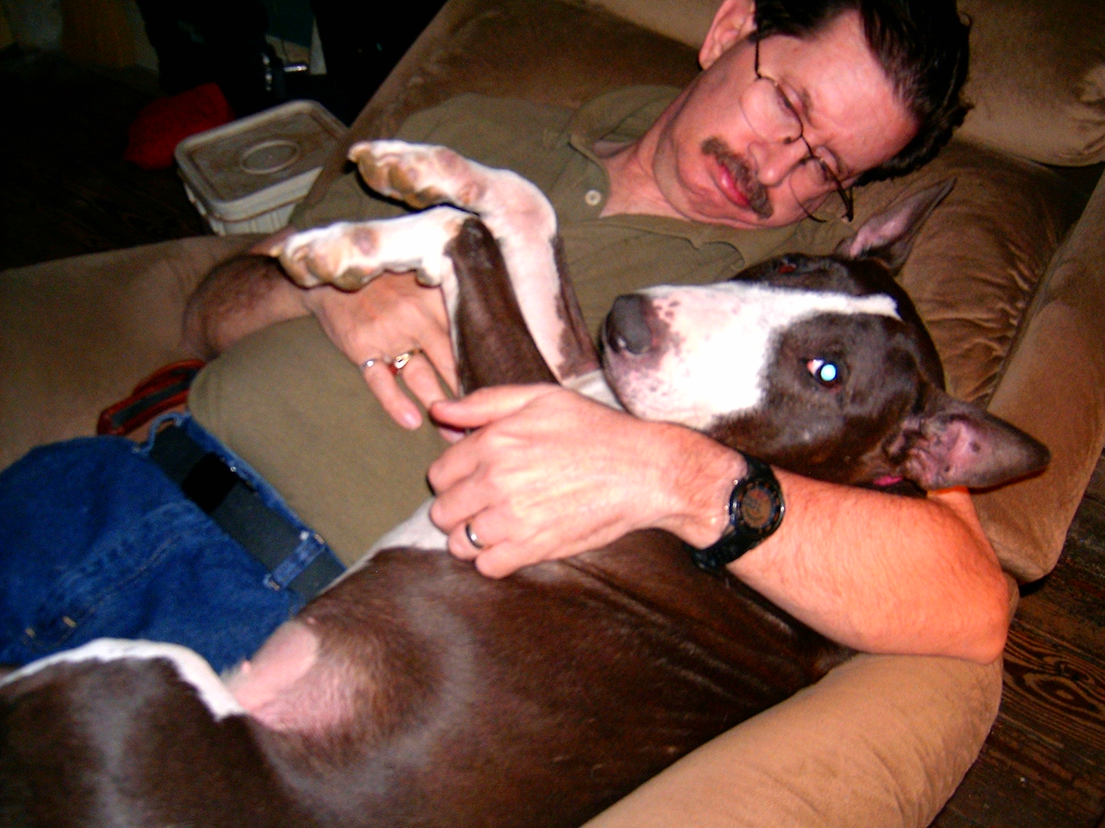 Over the years, my body has taken great punishment from our bull terriers. Cement block noggins to nose or face are common. Heads rammed into shins and other tender places too.