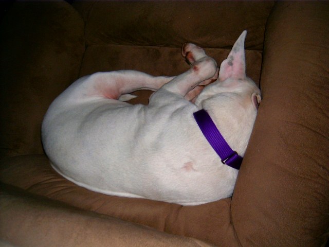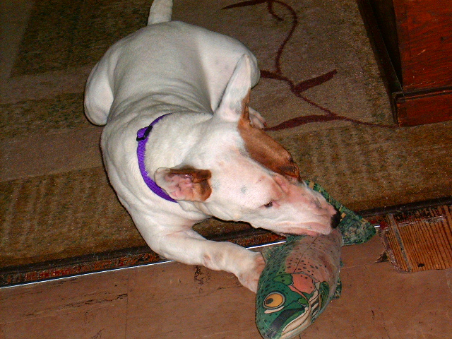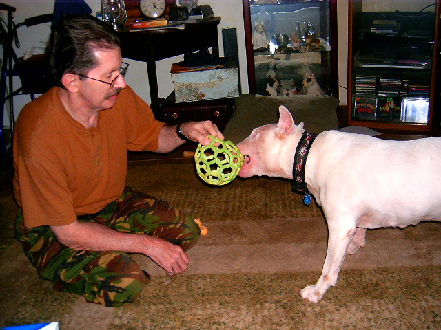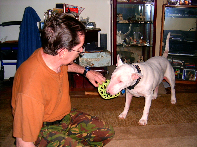 My Bull Terrier, Malcolm, took another shot at disaster before I answered. He held a large bone, poised in his mouth like a baseball bat, and barely missed taking out my shin. I unconsciously stepped out-of-the-way of sixty-five pounds of armed, muscled freight train on a ‘bully run’.