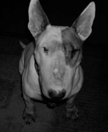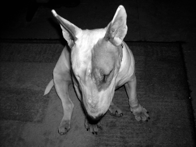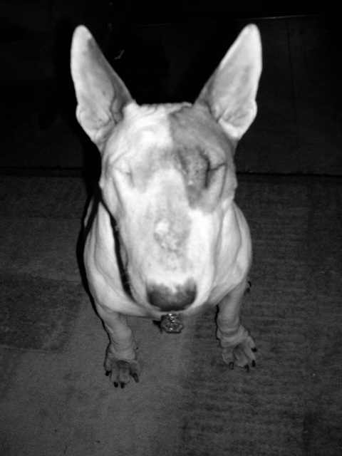 Lucy is a mercenary little girl, but then aren’t all bull terriers? If her Daddy has a cookie, she will give him her undivided attention. However, as soon as he is empty-handed, she’s on my lap. 😀
