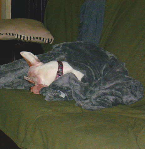 We haven’t turned our heat on yet and yesterday was a bit chilly. That plus the fact that little Lucy wasn’t up to par (*whispers so as not to embarrass her* “She had the runs.”) She made the use of the fuzzy blanket, a new thing for her. She likes it. She wanted back under it later too.