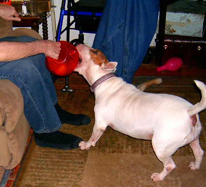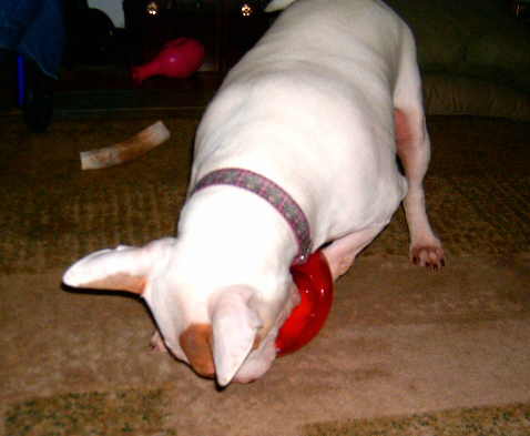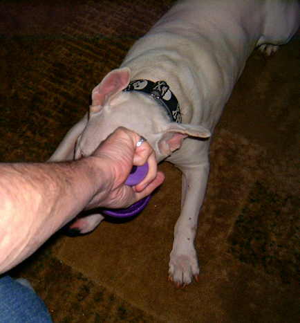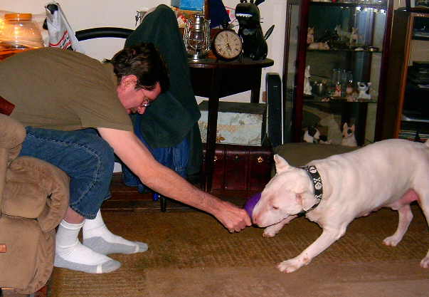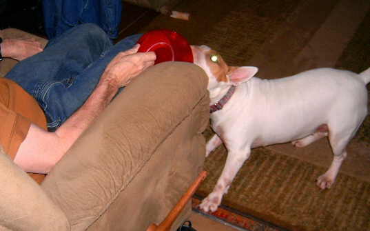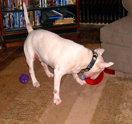 Lately, Gavin has been bugging The Curmudgeon to play throw the KONG Genius Leo Dog Toy for him at least twice a day. It looks like good exercise for The Curmudgeon since to get the toy from Gavin he has to work at it.