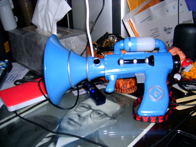 Me while aiming Minion fart blaster at The Curmudgeon: “Ve Haff ways uff making you drink the thickened stuff.”