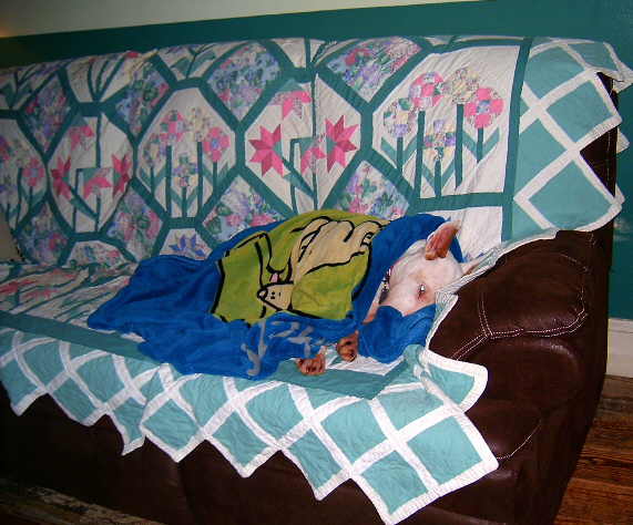 Then I went back to the couch, snuggled down with Lucy behind my knees, and went back to sleep. The pups and The Curmudgeon let me sleep until almost ten.