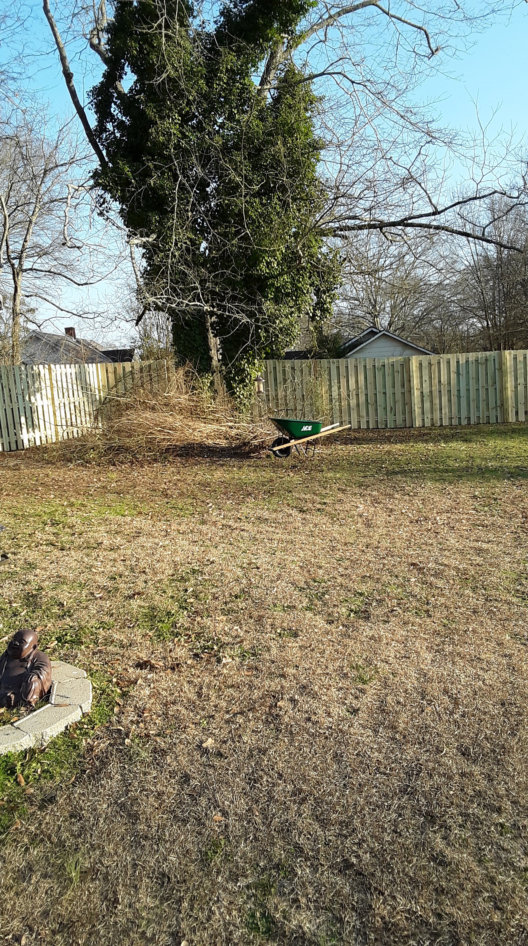 For now, I guess it is up to me to haul all the trimmings to the curb, put the spring on the gate to make it self closing, hang the blue bird house, and all the hangers for plants to hang from the fence.