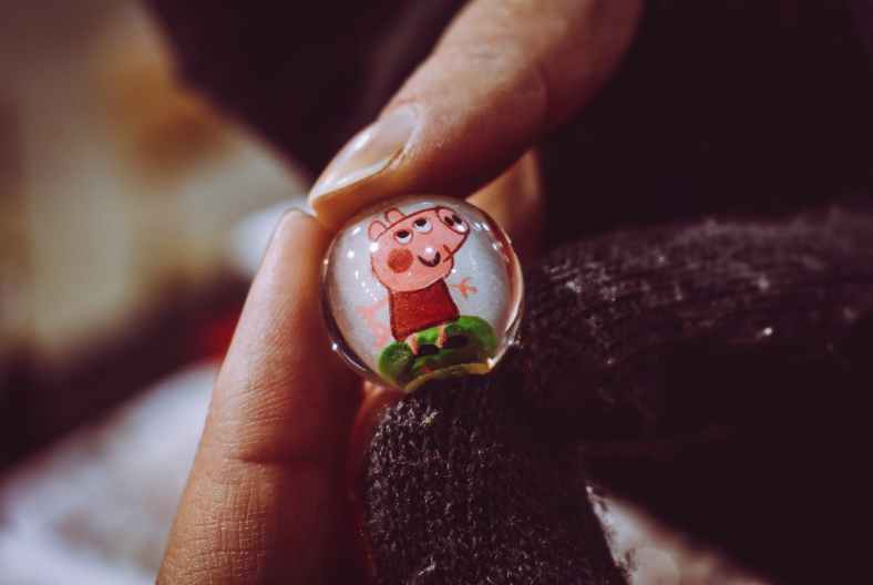 person holding peppa pig toy marble
