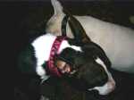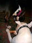 Another Bull Terrier person had an emergency when her silly boy jumped out of her Blazer and broke his leg. Poor baby, at his age the muscle is stronger than those young bones and with Bullies it is a common injury. These dogs don’t often use their heads for anything other than to keep their ears from knocking together.