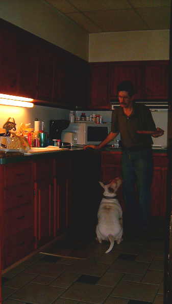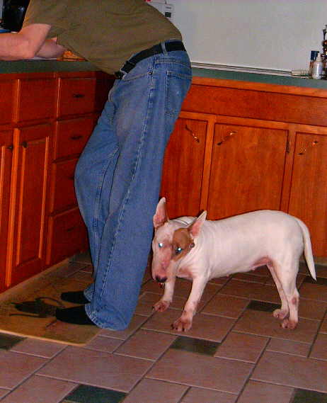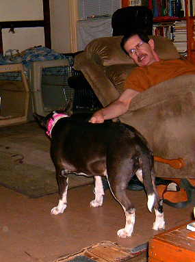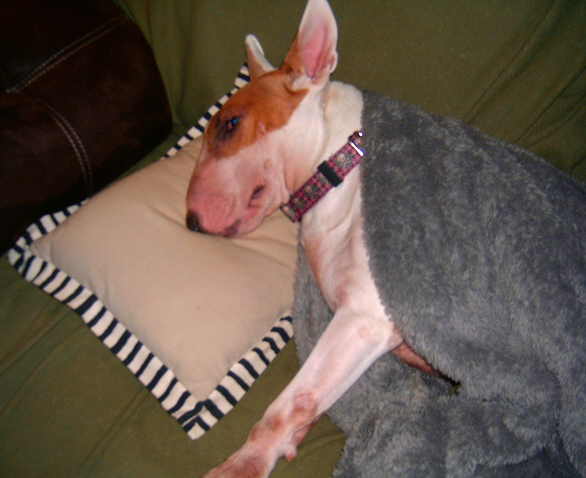 Patty is much improved from Sunday night. There have been no more let’s scare Mom and Dad incidents. She has taken advantage as is typical of a bull terrier. She’s been back in Daddy’s chair, a practice we stopped after the second chair had to go back to the store. Not from her, but from the poor workmanship. (Lazy Boy chairs are not what they used to be, their quality is way down.) Chair number 3 has its problems too but we’re sick of having to call them about the chairs. Next one, we buy elsewhere, and a different brand.
