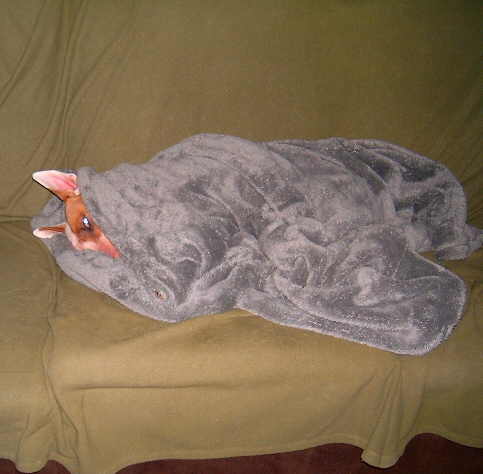 She protests every trip outside and is quick to dash back in. Then she insists on a warming period on the couch all wrapped up in her fuzzy blanket. Tonight she is sporting her grey one since the gold blanket is in the dryer at the moment.